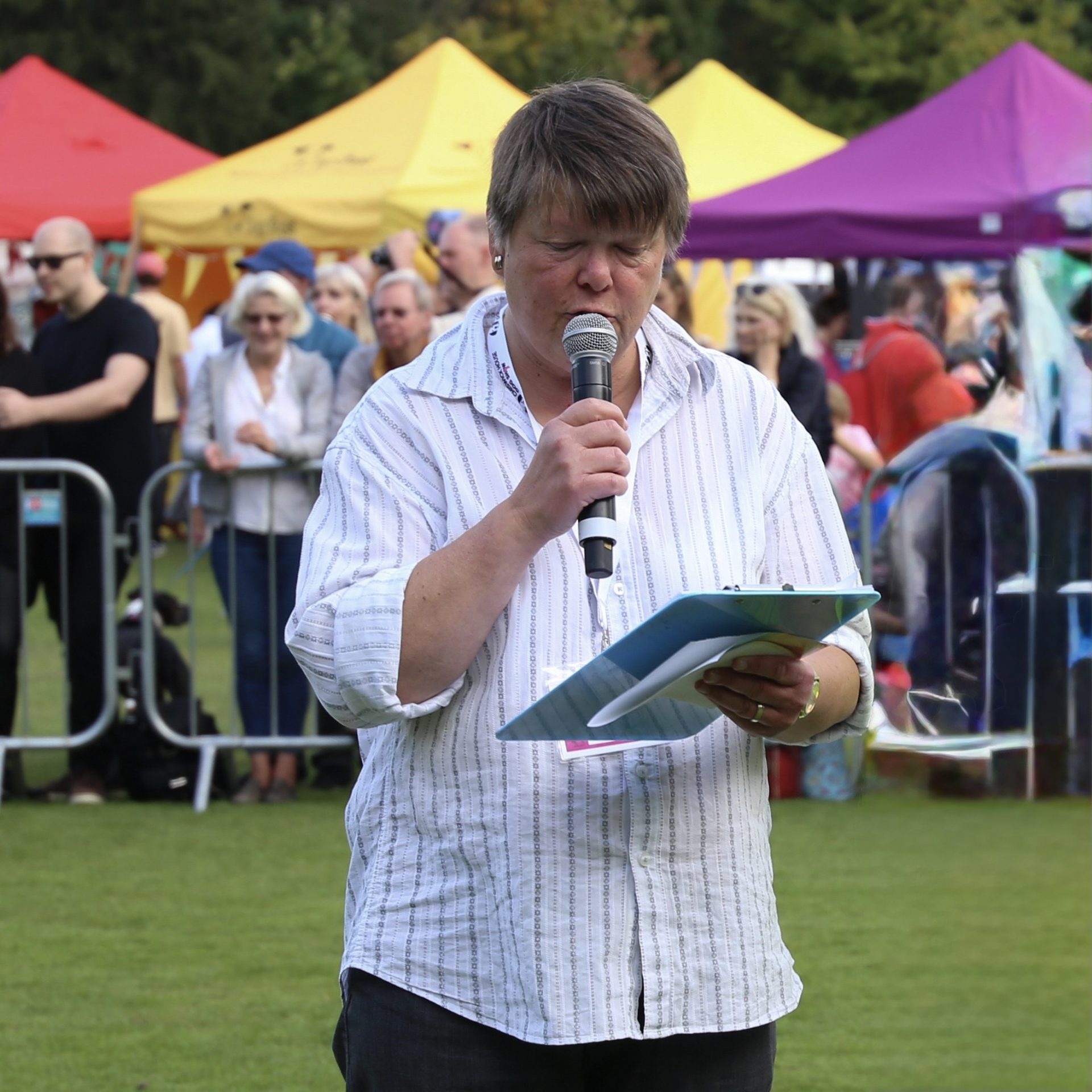Gill Thomas, known as “The Voice of the Dog Show,” retired from this role after the 2024 show. Often confused with Sandy Toksvig, this hasn’t always been her only role….. She was involved with the show from the very beginning, and for the majority of those 11 years she was the Chair of the Organising Committee (in many ways she WAS the Organising Committee) and its mostly through all her efforts that the Dog Show is where it is today. She gave up being chair after the show in 2015 but has always been there since, both as The Voice, and as a constant source of support and encouragement.